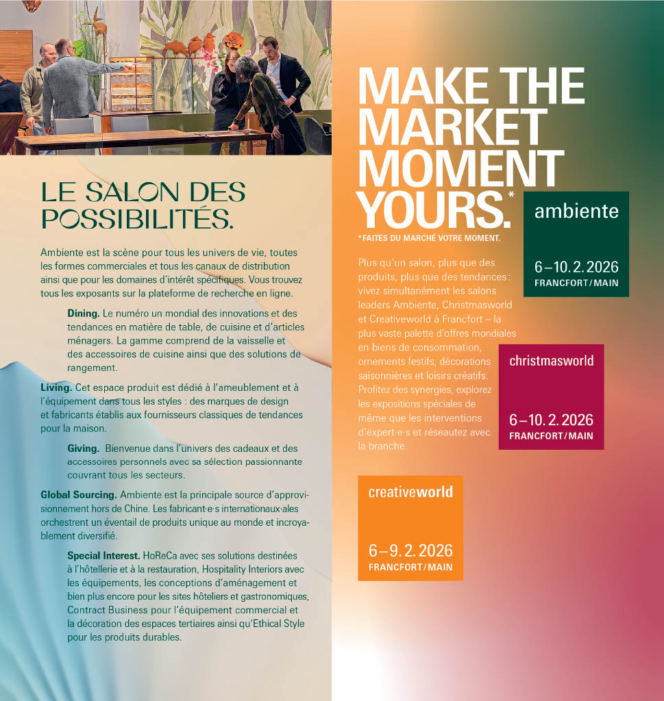 Ambiente est reconnu comme l’un des plus grands salons mondiaux dédiés aux biens de consommation. Il couvre un large éventail de domaines allant des arts de la table à la maison et à la décoration, en passant par les cadeaux, les accessoires et les solutions destinées au monde du travail. Cette diversité fait d’Ambiente un espace privilégié pour découvrir les tendances, les innovations produits et les opportunités d’affaires qui façonnent les secteurs de la distribution, du design, du retail et de l’hospitalité.
